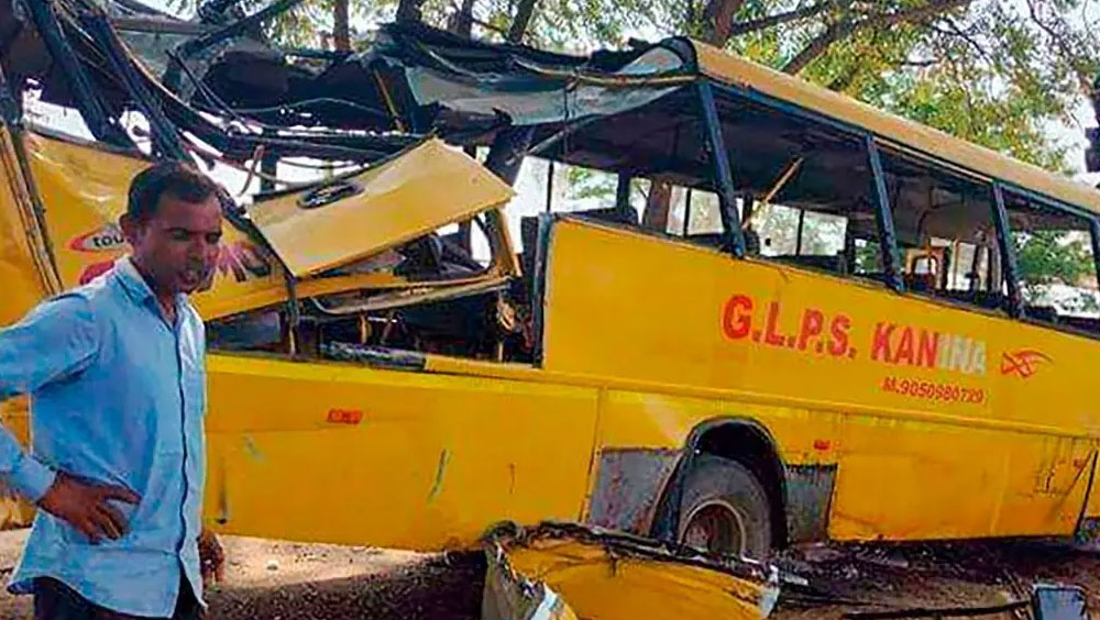 വ്യാഴാഴ്ച രാവിലെ 8.30 ഓടെ ഹരിയാനയിലെ കനിനയിലുള്ള ഉൻഹാനി ഗ്രാമത്തിന് സമീപമാണ് അപകടം നടന്നത്. ബസിൽ 40 കുട്ടികൾ ഉണ്ടായിരുന്നു. അമിത വേഗത്തിൽ സഞ്ചരിച്ചിരുന്ന ബസ് നിയന്ത്രണം നഷ്ടപ്പെട്ട് മരത്തിലിടിച്ച ശേഷം കീഴ്മേൽ മറിയുകയായിരുന്നു. ജിഎൽ പബ്ലിക് സ്കൂളിലെ വിദ്യാർത്ഥികളായ സത്യം, യുവരാജ്, വാൻഷ്, റിക്കി, അൻഷു, യാകുഷ് എന്നിവർക്കാണ് അപകടത്തിൽ ജീവൻ നഷ്ടമായത്. 20 കുട്ടികൾക്ക് പരിക്കേറ്റിരുന്നു. അപകടം നടന്ന സ്ഥലത്ത് വച്ചുതന്നെ ഡ്രൈവറെ അറസ്റ്റു ചെയ്തതായും വൈദ്യപരിശോധനയിൽ ഇയാൾ മദ്യലഹരിയിലായിരുന്നെന്ന് സ്ഥിരീകരിക്കപ്പെട്ടതായും പോലീസ് പറഞ്ഞു.