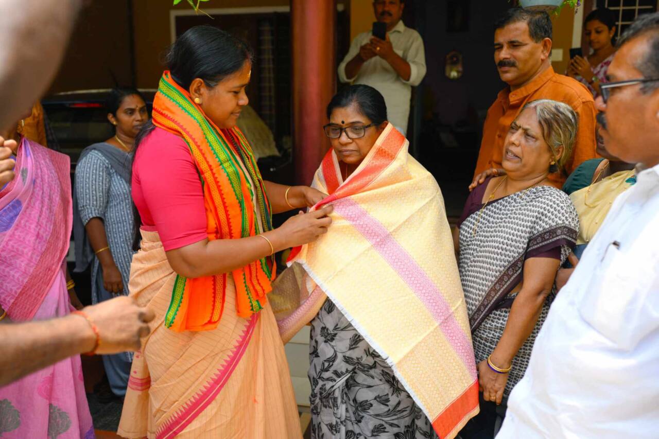 ആലപ്പുഴ പാർലിമെന്റ് മണ്ഡലം സ്ഥാനാർത്ഥി ശോഭാ സുരേന്ദ്രൻ രാജശ്രീ പിളളയെ കാവി ഷാൾ അണിയിച്ച് ഭാരതീയ ജനതാ പാർട്ടിയിലേക്ക് സ്വാഗതം ചെയ്തു.
