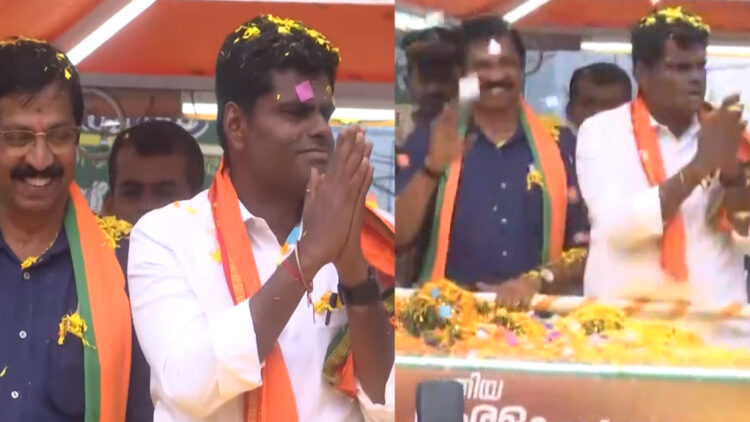 പാലക്കാട്: പാലക്കാട് എൻഡിഎ സ്ഥാനാർത്ഥി സി കൃഷ്ണകുമാറിന്റെ തെരഞ്ഞെടുപ്പ് പ്രചാരണത്തിന് ആവേശം പകർന്ന് ബിജെപി തമിഴ്നാട് അദ്ധ്യക്ഷൻ കെ അണ്ണാമലൈ. ആയിരക്കണക്കിന് ബിജെപി പ്രവർത്തകരാണ് പ്രചാരണത്തിന്റെ ഭാഗമായി സംഘടിപ്പിച്ച റോഡ് ഷോയിൽ പങ്കെടുത്തത്.