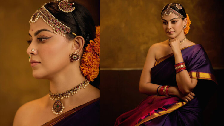 വയലറ്റ് നിറത്തിലെ പിങ്ക് ബോർഡർ സാരിയാണ് അനുശ്രീ ഉടുത്തിരിക്കുന്നത്. ട്രഡീഷ്ണൽ ആഭരണങ്ങളാണ് ഇതിനോടൊപ്പം ധരിച്ചിരിക്കുന്നത്. നെറ്റിച്ചുട്ടിയും നെക്ലേസും കമ്മലും അനുശ്രീയെ കൂടുതൽ മനോഹരമാക്കിയിട്ടുണ്ട്. സാരിക്ക് യോജിക്കുന്ന രീതിയിൽ കുപ്പി വളകളും മുടിയിൽ ജമന്തി പൂവും ചൂടിയിട്ടുണ്ട്.