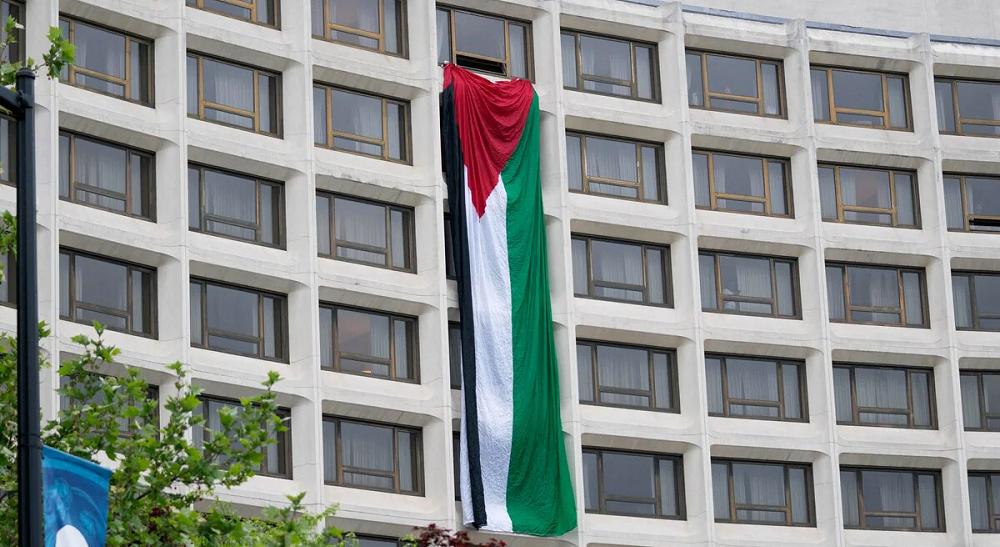 ബൈഡനു നേരെ പലസ്തീൻ അനുകൂല സംഘടനകളുടെ പ്രതിഷേധം; ഔദ്യോഗിക വിരുന്ന് നടന്ന ഹോട്ടലിൽ കൂറ്റൻ പലസ്തീൻ പതാക തൂക്കി