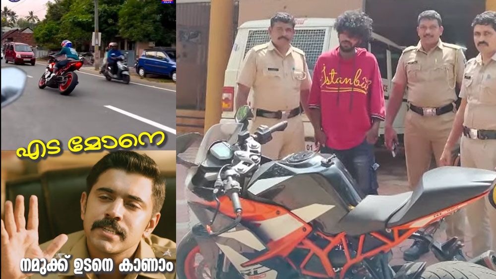 കഴിഞ്ഞ 21-നാണ് സംഭവം. എതിർദിശയിൽ നിന്ന് വരുന്ന കെഎസ്ആർടിസി ബസ്, കാറുകൾ എന്നിവയുടെ അരികിലൂടെ പറക്കുന്ന യുവാവ് പലയിടത്തും തലനാരിഴയ്ക്കാണ് രക്ഷപ്പെട്ടത്. സമൂഹമാദ്ധ്യമങ്ങളിൽ പങ്കുവച്ച ഈ വീഡിയോ, ‘ആക്ഷൻ ഹീറോ ബിജു’ എന്ന സിനിമയിലെ എസ്ഐ ബിജു പൗലോസ് ‘എടാ മോനെ, നമുക്ക് ഉടനെ കാണം’ എന്ന അടിക്കുറിപ്പോടെ പങ്കുവച്ചതിന് പിന്നാലെയാണ് പൊലീസ് കേസ് രജിസ്റ്റർ ചെയ്തത്. പൊലീസ് ഔദ്യോഗിക പേജിലൂടെയും ബൈക്ക് റേസിംഗ് വീഡിയോ പങ്കുവച്ചിരുന്നു.