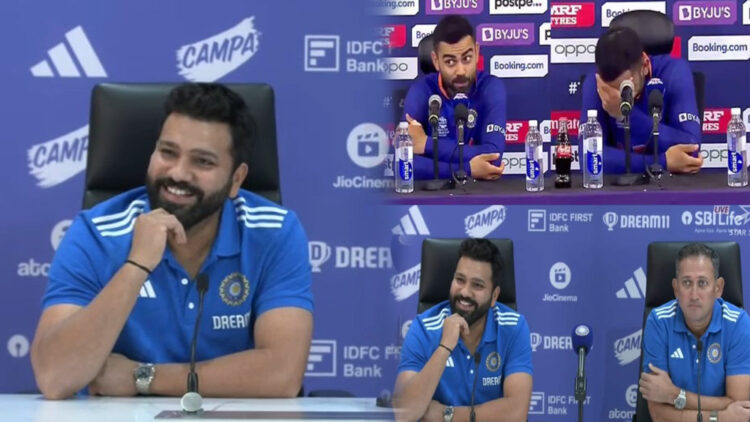 ഐപിഎല്ലിൽ വിരാട് കോലി റൺസ് നേടുന്നുണ്ടെങ്കിലും വേഗം കുറവാണെന്നും ഇത് ലോകകപ്പിലെത്തുമ്പോൾ ടീമിനെ ബാധിക്കുമോ എന്നായിരുന്നു ചോദ്യം. ഇത് കേട്ടപാടെ ക്യാപ്റ്റൻ രോഹിത് പൊട്ടിച്ചിരിച്ചു. ഇതിന് സമാനമായി ഒരു ചോദ്യം 2021 ലോകകപ്പിന് മുമ്പ് വിരാട് കോലിയും നേരിട്ടിരുന്നു. രോഹിത്തിന്റെ ഫോമിനെക്കുറിച്ചായിരുന്നു അന്ന് ക്യാപ്റ്റനായിരുന്ന കോലിയോട് മാദ്ധ്യമപ്രവർത്തകർ ചോദിച്ചത്. അന്ന്