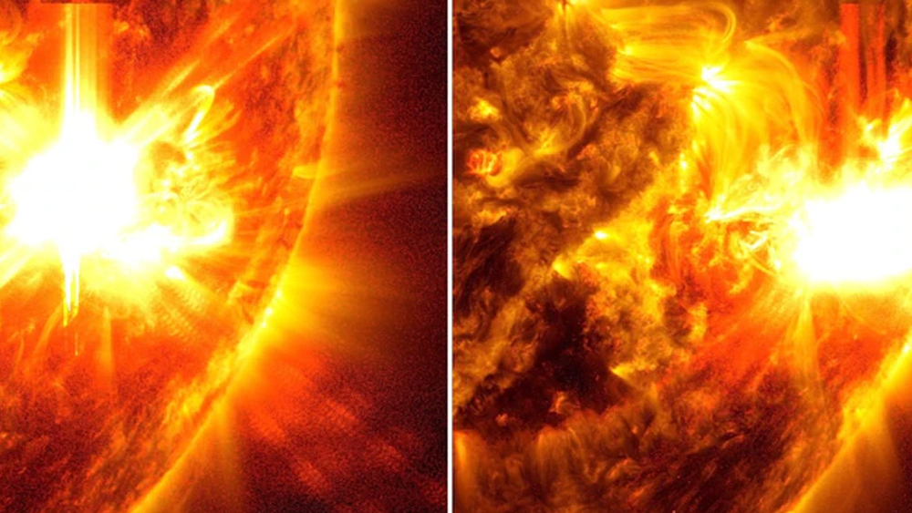 സൂര്യനിൽ നടന്ന രണ്ട് സ്ഫടനങ്ങളുടെ ചിത്രങ്ങളാണ് നാസ പുറത്തുവിട്ടിരിക്കുന്നത്. മേയ് 10, 11 തീയതികളിലാണ് ഈ സ്ഫോടനങ്ങൾ നടന്നത്. മേയ് 10-ാം തീയതി ഇന്ത്യൻ സമയം രാത്രി 9.23ഓടെയും, മേയ് 11-ാം തീയതി ഇന്ത്യൻ സമയം രാവിലെ 7.44 ഓടെയുമാണ് സ്ഫോടനം നടന്നത്. ഈ സ്ഫോടനങ്ങളെ X5.8 and X1.5 എന്നിങ്ങനെ തരംതിരിച്ചതായും നാസ അറിയിച്ചു.