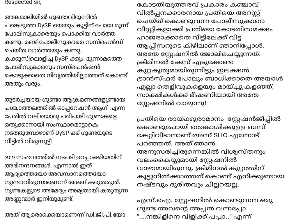 പ്രതിയെ രായ്ക്കുരാമാനം സ്റ്റേഷൻ ജീപ്പിൽ കാെണ്ടുപോയി തെങ്കാശിക്കുള്ള ബസിൽ കയറ്റി വിടാനാണ് എസ്എച്ച്ഒ പറഞ്ഞതെന്നും ഉമേഷ് കത്തിൽ പറയുന്നു. ഇപ്പോൾ പുറത്തുവന്ന ഗുണ്ടാവിരുന്ന് ആദ്യത്തെയോ അവസാനത്തെയോ എന്ന് അങ്ങ് കരുതരുത്. ഗുണ്ടകളുടെ അമേദ്യം അമൃതാക്കുന്ന അണ്ണന്മാർ ഇനിയുമുണ്ടെന്നും പൊലീസുകാരൻ പറയുന്നു.