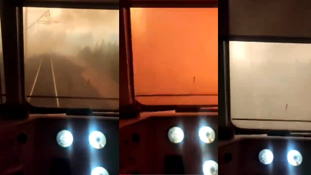 In Russian Buryatia, a train was filmed from the driver’s cab as it rushes through a forest fire.