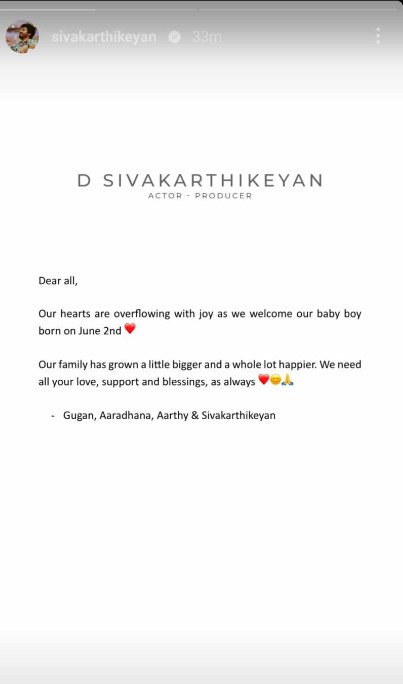 ശിവകാർത്തികേയന്റെ വികാരഭരിതമായ ഫെയ്സ്ബുക്ക് കുറിപ്പാണ് സമൂഹമാദ്ധ്യമങ്ങളിൽ വൈറലാകുന്നത്. ‘ബ്ലെസ്ഡ് വിത്ത് എ ബേബി ബോയ്’ എന്ന ഹാഷ്ടാഗോടെയാണ് താരം സമൂഹമാദ്ധ്യമത്തിൽ പങ്കുവച്ചത്. ‘ഞങ്ങളുടെ ഹൃദയം സന്തോഷത്താൽ നിറയുകയാണ്. നമ്മുടെ കുടുംബത്തിൽ ഒരാൾ കൂടി എത്തിയിരിക്കുന്നു. വളരെയധികം സന്തോഷമുണ്ട്. എല്ലാവരുടെ സ്നേഹവും പ്രാർത്ഥനയും ഞങ്ങളോടൊപ്പം എപ്പോഴും ഉണ്ടാവണം’ -ശിവകാർത്തികേയൻ ഇൻസ്റ്റഗ്രാമിൽ കുറിച്ചു.