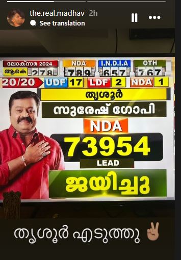 തിരുവനന്തപുരം: തൃശൂരിൽ നിന്ന് പാർലമെന്റിലേക്ക് ജയിച്ച സുരേഷ് ഗോപിയെ അഭിനന്ദിച്ച് മകൻ മാധവ് സുരേഷ്. തൃശൂർ എടുത്തു എന്ന അടിക്കുറിപ്പോടെയാണ് അച്ഛന്റെ ലീഡ് ഉൾപ്പെടെയുള്ള ഫോട്ടോ ഇൻസ്റ്റഗ്രാം സ്റ്റോറിയായി മാധവ് പങ്കുവച്ചത്. സഹോദരി ഭാഗ്യയുടെ ഭർത്താവ് ശ്രേയസ് പങ്കുവച്ച സ്റ്റോറിയും മാധവ് റീപോസ്റ്റ് ചെയ്തിട്ടുണ്ട്. മാറ്റം അനിവാര്യമാണെന്ന അടിക്കുറിപ്പോടെയാണ് ചിത്രം പങ്കുവച്ചിരിക്കുന്നത്.