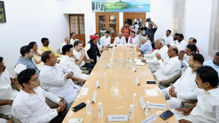 സമാജ്വാദി പാർട്ടി അദ്ധ്യക്ഷൻ അഖിലേഷ് യാദവ്, എൻസിപി-എസ്സിപി നേതാക്കളായ ശരദ് പവാർ, സുപ്രിയ സുലെ, സിപിഎം ജനറൽ സെക്രട്ടറി സീതാറാം യെച്ചൂരി, ഡിഎംകെ അദ്ധ്യക്ഷൻ എംകെ സ്റ്റാലിൻ, ഝാർഖണ്ഡ് മുഖ്യമന്ത്രിയും ജെഎംഎം നേതാവുമായ ചമ്പായി സോറൻ തുടങ്ങിയ സഖ്യകക്ഷികൾ യോഗത്തിൽ പങ്കെടുത്തു. കൂടാതെ, കോൺഗ്രസ് നേതാക്കളും മല്ലികാർജുൻ ഖാർഗെയുടെ വസതിയിൽ എത്തിച്ചേർന്നിട്ടുണ്ട്.