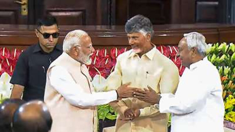 ന്യൂഡൽഹി: എൻഡിഎ പാർലമെൻ്ററി പാർട്ടി യോഗത്തിൽ നരേന്ദ്രമോദിയുടെ നേതൃത്വ മികവിനെ പ്രശംസിച്ച് ബിഹാർ മുഖ്യമന്ത്രിയും ജെഡിയു തലവനുമായ നിതീഷ് കുമാർ. രാജ്യത്തെ വികസനത്തിന്റെ പാതയിൽ മുന്നോട്ട് നയിക്കാൻ നരേന്ദ്രമോദിക്ക് പിന്നിൽ ഒറ്റക്കെട്ടായി അണിനിരക്കുമെന്ന്  പാർലമെന്റിന്റെ സെൻട്രൽ ഹാളിൽ നടന്ന യോ​​ഗത്തിൽ അദ്ദേഹം പറഞ്ഞു.