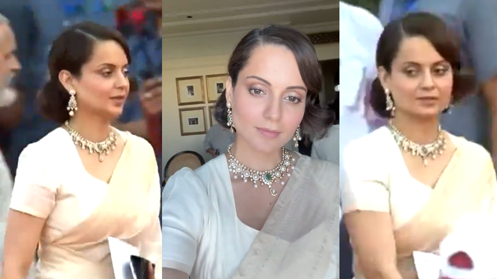 ‌ വെളള നിറത്തിലുള്ള സാരിയാണ് കങ്കണയുടെ വേഷം. വെള്ളമുത്തും മരതകക്കല്ലും പിടിപ്പിച്ച മാലയും കമ്മലുമാണ് കങ്കണ അണിഞ്ഞിരിക്കുന്നത്. വീഡിയോ പുറത്തുവന്നതിന് പിന്നാലെ നിരവധി പേരാണ് കങ്കണയ്‌ക്ക് ആശംസകളറിയിച്ച് രം​ഗത്തെത്തിയത്.