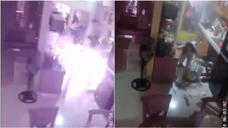 ഇതിന്റെ ആഘാതത്തിൽ വീട്ടമ്മ തെറിച്ച് വീണു. അവിടെയുണ്ടായിരുന്ന പാത്രങ്ങളും മറ്റ് സാധനങ്ങളും നാലുപാടും ചിതറി. പരിക്കേൽക്കാതെ തലനാരിഴയ്ക്ക് രക്ഷപ്പെട്ട യുവതി നിലവിളിച്ചുകാെണ്ട് ഹാളിലേക്ക് ഓടുന്നതും കാണാം. ഇതിനിടെ ഒരാൾ അടുക്കളയിൽ വന്നു നോക്കുന്നുമുണ്ട്. പൊട്ടിത്തെറിയിൽ വലിയൊരു തീഗോളമാണ് രൂപപ്പെട്ടത്.