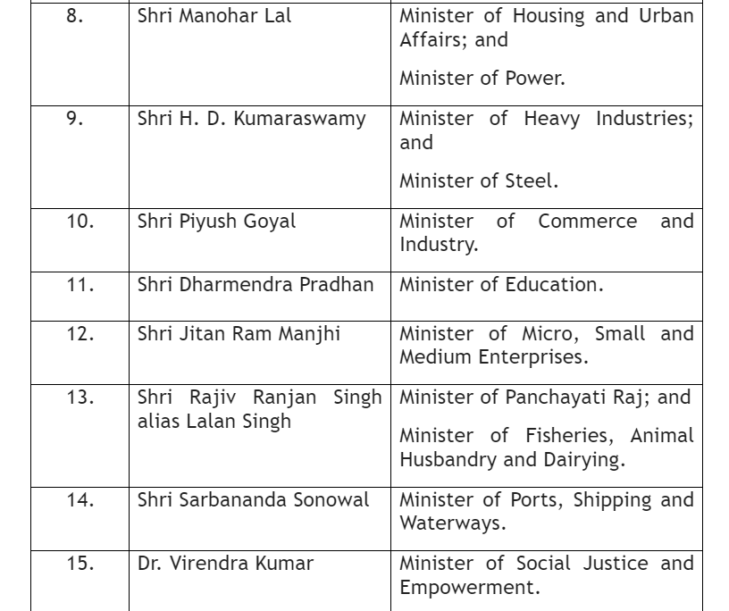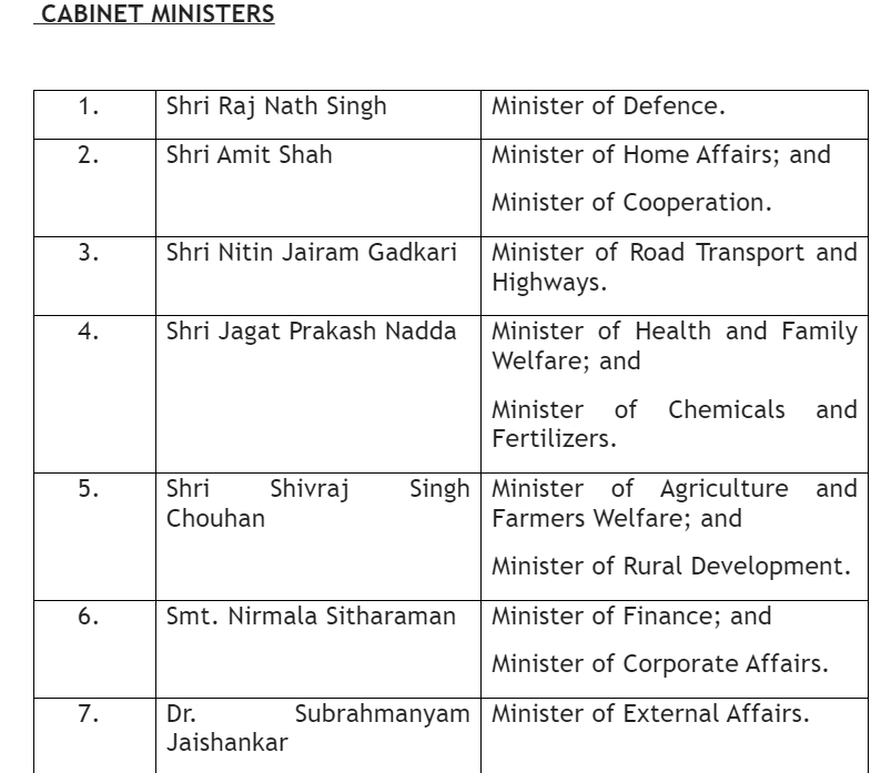 പാർട്ടി ദേശീയ അദ്ധ്യക്ഷനായ ജെ.പി നദ്ദയ്ക്ക് ആരോഗ്യവകുപ്പ് നൽകി. വ്യോമയാനം റാം മോഹൻ നായിഡുവിനും, വാണിജ്യം പീയൂഷ് ഗോയലിനുമാണ് നൽകിയിരിക്കുന്നത്. മോദി മന്ത്രിസഭയിലേക്ക് ആദ്യമായി പ്രവേശനം നേടിയ ശിവരാജ് സിംഗ് ചൗഹാന് കാർഷിക വകുപ്പാണ് നൽകിയിരിക്കുന്നത്. കർഷക കുടുംബത്തിൽ ജനിച്ചുവളർന്ന ചൗഹാൻ മദ്ധ്യപ്രദേശിൽ ഏറ്റവുമധികം കാലം മുഖ്യമന്ത്രിയായി തുടർന്ന ജനപ്രിയ നേതാവാണ്.