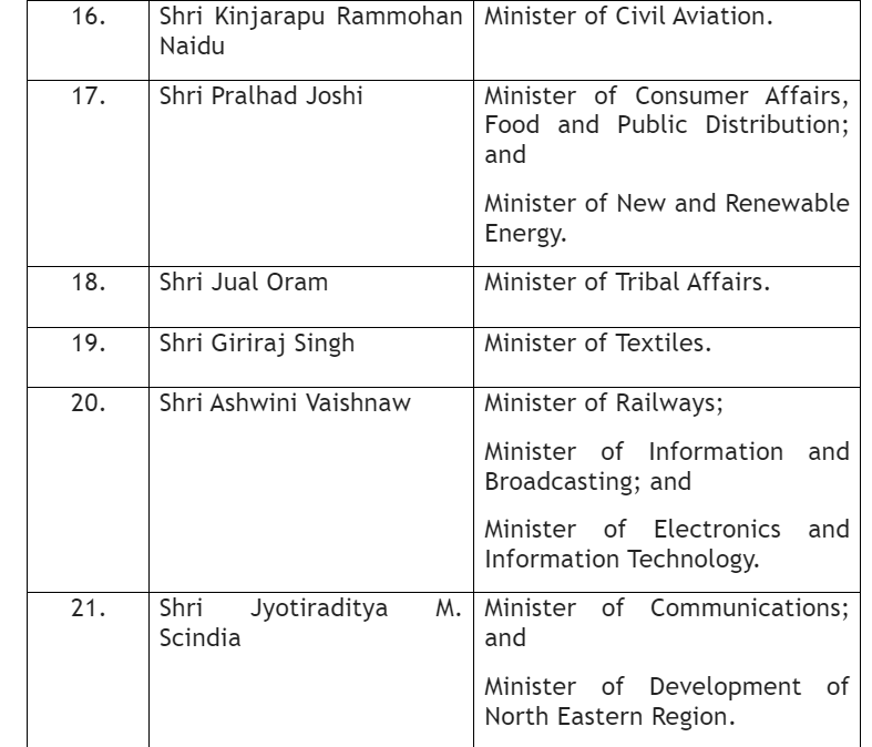 ഗതാഗത വകുപ്പിൽ രണ്ട് സഹമന്ത്രിമാരെ നിയോഗിച്ചു. ഹർഷ് മൽഹോത്ര, അജയ് ടംത എന്നിവർ സഹമന്ത്രിമാരാകും. റെയിൽവേ മന്ത്രി അശ്വിനി വൈഷ്ണവിന് റെയിൽവേ കൂടാതെ വാർത്താവിതരണ വകുപ്പും നൽകി. മുൻ മന്ത്രിസഭയിൽ ആരോഗ്യം കൈകാര്യം ചെയ്തിരുന്ന മൻസൂഖ് മാണ്ഡവ്യ ഇത്തവണ തൊഴിൽ വകുപ്പ് കൈകാര്യം ചെയ്യും. വിദ്യാഭ്യാസ വകുപ്പിൽ ധർമേന്ദ്ര പ്രധാൻ തുടരും. എച്ച്.ഡി കുമാരസ്വാമിക്ക് ഉരുക്ക്, ഖന വ്യവസായ വകുപ്പുകളും കിരൺ റിജിജുവിന് പാർലമെന്ററി കാര്യവും ന്യൂനപക്ഷ ക്ഷേമവും നൽകി.