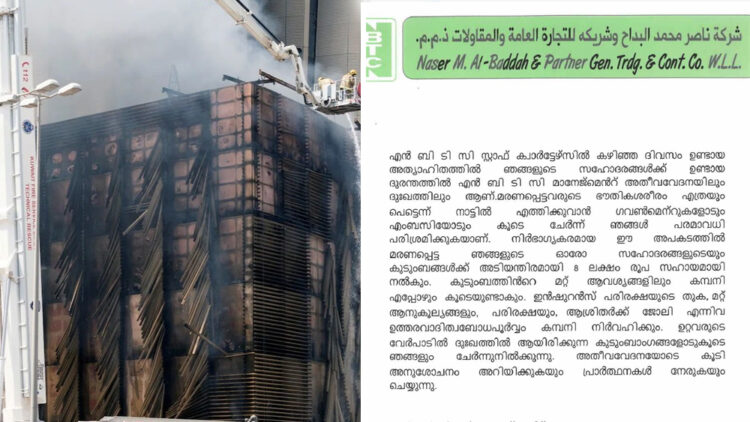 ന്യൂഡൽഹി: കുവൈത്തിലെ ദുരന്തത്തിൽ മരിച്ച മലയാളികളുടെ കുടുംബത്തിന് ധനസഹായം പ്രഖ്യാപിച്ച് എൻബിടിസി മാനേജ്‌മെന്റ്. അടിയന്തരമായി എട്ടുലക്ഷം രൂപനൽകുമെന്നും മൃതദേഹം നാട്ടിലെത്തിക്കാൻ എംബസിയുമായി ചേർന്ന് പ്രവർത്തിക്കുകയാണെന്നും കമ്പനി പ്രസ്താവനയിലൂടെ അറിയിച്ചു. തീപിടത്തത്തിൽ മരിച്ചവർ ജോലി ചെയ്തിരുന്നത് എൻബിടിസി ഗ്രൂപ്പിലാണ്. കമ്പനിയുടെ ലേബർ ക്യാമ്പിലാണ് തീപിടിത്തമുണ്ടായത്.
