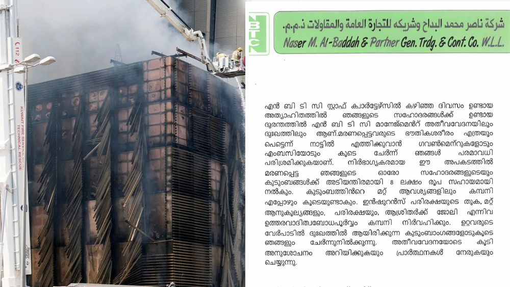 കുവൈത്ത് ദുരന്തം: മരിച്ച ജീവനക്കാരുടെ കമ്പനി 8ലക്ഷം അടിയന്തരമായി നൽകും