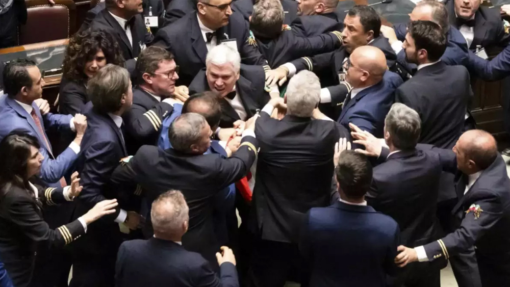 റോം: ഇറ്റാലിയൻ പാർലമെന്റിൽ ഭരണപ്രതിപക്ഷ ജനപ്രതിനിധികൾ തമ്മിൽ അടിപിടി. പ്രാദേശിക ബിൽ പാസാക്കുന്നതുമായി ബന്ധപ്പെട്ട വാക്കുതർക്കമാണ് തമ്മിലടിയിൽ കലാശിച്ചത്. നെഞ്ചിനും തലയ്ക്കും പരിക്കേറ്റ ഒരാളെ ആശുപത്രിയിൽ പ്രവേശിപ്പിച്ചു. ബില്ലിന്റെ പേരിൽ പ്രതിപക്ഷ-ഭരണപക്ഷ പാർലമെന്റേറിയന്മാർ തമ്മിൽ തമ്മിലടിക്കുന്ന ദൃശ്യങ്ങൾ സോഷ്യൽമീഡിയയിൽ വൈറലാവുകയാണ്.