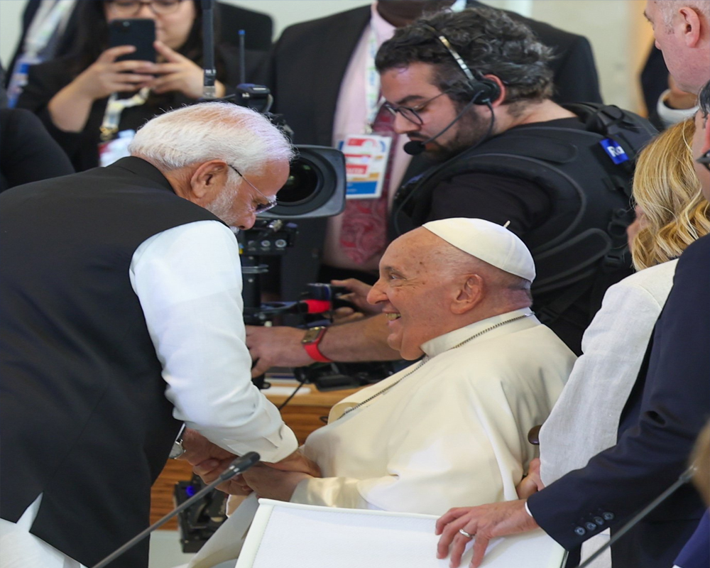 ജി 7 ഉച്ചകോടിയുടെ ഔട്ട്‌റീച്ച് സെഷനിൽ പ്രധാനമന്ത്രി നരേന്ദ്രമോദി ഫ്രാൻസിസ് മാർപാപ്പയുമായി കൂടിക്കാഴ്ച നടത്തി. ഉ​ച്ച​കോ​ടി​യി​ലെ​ത്തി​യ ഫ്രാ​ൻ​സി​സ് മാ​ർ​പാ​പ്പ​യെ പ്ര​ധാ​ന​മ​ന്ത്രി ആലിം​ഗനം ചെയ്തു. കൂടാതെ  മാർപാപ്പയെ ഇന്ത്യ സന്ദർശിക്കാൻ പ്രധാനമന്ത്രി ക്ഷണിക്കുകയും ചെയ്തു. ജനങ്ങളെ സേവിക്കാനുള്ള പോപ്പിന്റെ പ്രതിബദ്ധതയെ പ്രധാനമന്ത്രി അഭിനന്ദിച്ചു.