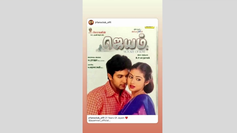 തെന്നിന്ത്യൻ സൂപ്പർ താരം ജയം രവിയും ഭാര്യ ആരതിയും വിവാഹമോചിതരാകുന്നുവെന്ന വാർത്തകളിൽ ആദ്യ പ്രതികരണം. നടന്റെ ഭാര്യ ആരതിയാണ് സോഷ്യൽ മീഡിയയിലെ പ്രചരണങ്ങൾക്ക് നിശബ്ദമായി മറുപടി നൽകിയത്.മോഹൻ രവിയുടെ ആദ്യ ചിത്രമായ ജയത്തിന്റെ 21-ാം വാർഷികത്തിൽ പോസ്റ്റർ പങ്കുവച്ചാണ് ഊഹാപോഹങ്ങൾക്ക് മറുപടി നൽകിയത്.