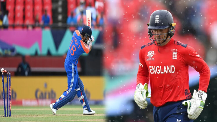 കോലിയെ ടോപ്ലി ബൗൾഡാക്കിയപ്പോൾ പന്തിനെ സാംകരൻ ബെയ്ർസ്റ്റോയുടെ കൈകളിലെത്തിക്കുകയായിരിന്നു. 26 പന്തിൽ 37 റൺസുമായി രോഹിത് ശർമ്മയും 7 പന്തിൽ 13 റൺസുമായി സൂര്യകുമാർ യാദവുമാണ് ക്രീസിൽ. വരും മണിക്കൂറിലും ശക്തമായ മഴയാണ് ഗയാനയിൽ പ്രവചിക്കുന്നത്. മത്സരം പൂർണമായി നടക്കാൻ സാദ്ധ്യതയില്ലെന്നാണ് വിലയിരുത്തലുകൾ.