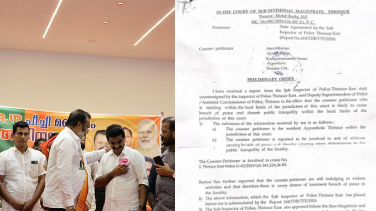 ഇന്നലെയാണ് ഐപിസി 170-ാം വകുപ്പ് പ്രകാരം സബ് ഡിവിഷണൽ മജിസ്‌ട്രേറ്റ് തൃശൂർ ജില്ലാ അദ്ധ്യക്ഷനെ സ്ഥിരം കുറ്റവാളി ചുമത്തി ഉത്തരവിറക്കിയത്. തൃശൂർ ഈസ്റ്റ് പൊലീസാണ് സബ് ഡിവിഷണൽ മജിസ്‌ട്രേറ്റിന് ഇത് സംബന്ധിച്ച റിപ്പോർട്ട് കൈമാറിയത്. രാഷ്‌ട്രീയ പകപോക്കലാണെന്നും നിയമപരമായി നേരിടുമെന്നും ബിജെപി പറഞ്ഞു.