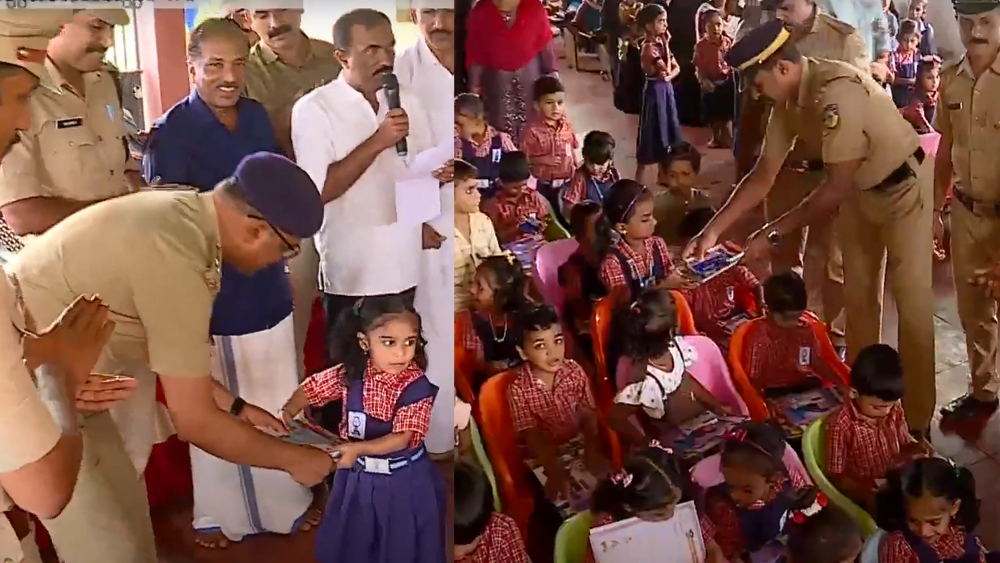 കേസ് അന്വേഷണത്തിന്റെ ഭാ​ഗമായാണ് പൊലീസ് ആദ്യം സ്കൂളിലെത്തിയത്. സമ്മാനങ്ങളുമായെത്തിയ ഉദ്യോ​ഗസ്ഥർ ഓരോരുത്തർക്കും പുസ്തകങ്ങളും ക്രയോണും വിതരണം ചെയ്തു. നഷ്ടപ്പെട്ട പുസ്തകങ്ങൾക്ക് പകരം പുതിയത് കിട്ടിയതിന്റെ സന്തോഷത്തിലാണ് കുരുന്നുകൾ. കേസ് അന്വേഷിക്കാനെത്തിയപ്പോൾ പേടിയൊടെ നോക്കിക്കണ്ട പൊലീസ് ഉദ്യോ​ഗസ്ഥർ സമ്മാനങ്ങളുമായി എത്തിയതോടെ കുട്ടികൾക്ക് അവർ കാക്കി മാമന്മാരായി.
