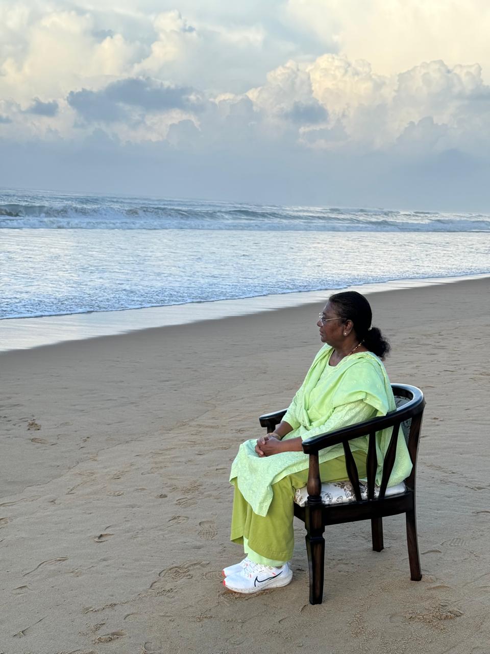 “ജീവിതത്തിന്റെ സത്തയുമായി നമ്മെ കൂടുതൽ അടുപ്പിക്കുകയും നാം പ്രകൃതിയുടെ ഭാഗമാണെന്ന് ഓർമ്മപ്പെടുത്തുകയും ചെയ്യുന്ന സ്ഥലങ്ങളുണ്ട്. പർവ്വതങ്ങളും വനങ്ങളും നദികളും കടൽത്തീരങ്ങളും ഉള്ളിലെ എന്തിനെയോ വല്ലാതെ ആകർഷിക്കുന്നു. ഞാനിന്ന് കടൽത്തീരത്ത് കൂടെ നടക്കുമ്പോൾ ചുറ്റുമുള്ളവയുമായി ഒരു കൂട്ടായ്മ അനുഭവപ്പെട്ടു. ഇളം കാറ്റ്, തിരമാലകളുടെ ശബ്ദം എല്ലാം. തികച്ചും ഒരു ധ്യാനാനുഭവം ആയിരുന്നു” രാഷ്ട്രപതി എക്സിൽ കുറിച്ചു.