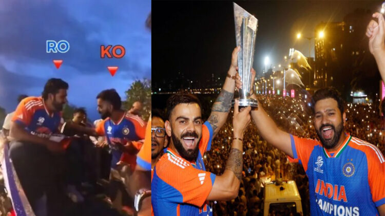 സൂര്യകുമാർ യാദവ് പകർത്തിയ വീഡിയോയാണിത്. ബസിന് ഓരം ചേർന്നിരിക്കുന്ന രോഹിത് ശർമ്മയ്ക്ക് അരികിലേക്ക് ദേശീയ പതാകയുമായി നടന്നെത്തിയ കോലി, രോഹിത്തിനെ ചിത്രമെടുക്കാൻ വിളിച്ചുകൊണ്ടുപോകുകയായിരുന്നു. രോഹിത് അദ്യമാെന്ന് മടിച്ചെങ്കിലും ഉറ്റസൃഹൃത്തിന്റെ നിർബന്ധത്തിന് പിന്നീട് വഴങ്ങി. ഇതിന് പിന്നാലെയാണ് ആരാധകർക്ക് മുന്നിൽ ഇരുവരും കിരീടം ഉയർത്തി ആഘോഷിച്ചതും ചിത്രം പകർത്തിയതും.