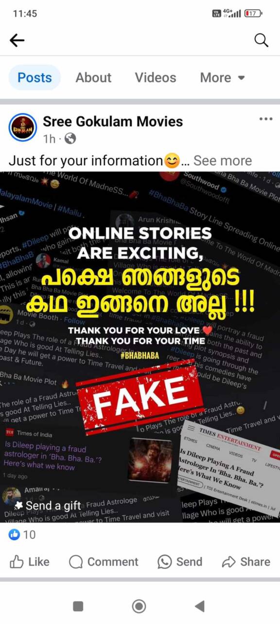 ഭഭബയിൽ ദിലീപ് വ്യാജ ജ്യോതിഷാനായാണ് എത്തുന്നതെന്ന രീതിയിലെ വാർത്തകളുടെ സ്ക്രീൻ ഷോട്ടുകൾ സഹിതമുള്ള പോസ്റ്ററാണ് ഗോകുലം മൂവീസ് സമൂഹമാദ്ധ്യമങ്ങളിൽ പങ്കുവച്ചിരിക്കുന്നത്. ജസ്റ്റ് ഫോർ എ ഇൻഫർമേഷൻ എന്ന ക്യാപ്ഷനോടെയാണ് പോസ്റ്റർ പങ്കുവച്ചിരിക്കുന്നത്. പോസ്റ്ററിൽ ‘ഓൺലൈൻ മാദ്ധ്യമങ്ങളെല്ലാം ആവേശത്തിലാണ്. പക്ഷെ, ഞങ്ങളുടെ കഥ ഇങ്ങനെയല്ല, നിങ്ങളുടെ സമയത്തിനും നിങ്ങൾക്കും നന്ദി അറിയിക്കുന്നു. ഇത് വ്യാജമാണ്’ എന്നാണ് കുറിച്ചിരിക്കുന്നത്.