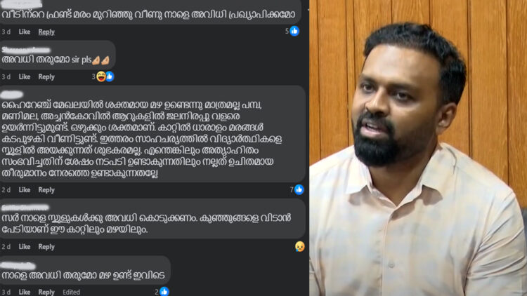റെഡ് അലേർട്ട് ആണെങ്കിൽ അവധി പ്രഖ്യാപിക്കുന്നതിൽ തെറ്റില്ല. മറ്റ് അലേർട്ടുകൾ നിലനിൽക്കുന്ന സാഹചര്യത്തിൽ തഹസീൽദാർമാരിൽ നിന്നും വില്ലേജ് ഓഫീസർമാരിൽ നിന്നും റിപ്പോർട്ട് തേടിയതിന് ശേഷമാണ് അവധി പ്രഖ്യാപിക്കുന്നത്. കളക്ടർമാരുടെ പേജുകളിൽ അവധി ആവശ്യപ്പെട്ടുള്ള വിദ്യാർഥികളുടെ ബഹളം സ്ഥിരമാണെന്നും ഇത്തരം പ്രവർത്തിയിലൂടെ ഔദ്യോഗിക കൃത്യനിർവ്വഹണം തടസ്സപ്പെടുത്തരുതെന്നും പ്രേം കൃഷ്ണൻ പറഞ്ഞു.