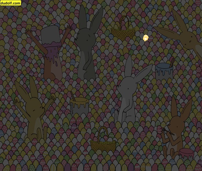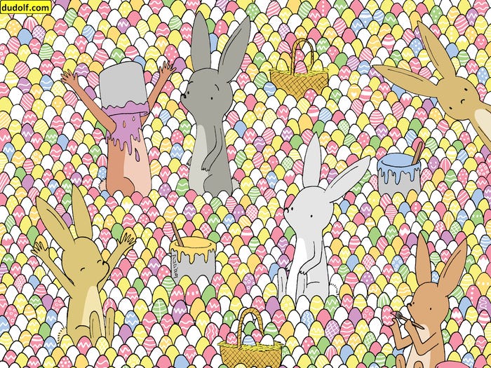നമുക്കൊരു ഗെയിം കളിക്കാം. ഇതിൽ കുട്ടികൾക്ക് മാത്രമല്ല, മുതിർന്നവർക്കും പങ്കുചേരാം. ഈ ഗെയിമിനായി ഒരു കാർട്ടൂൺ ചിത്രമാണ് നൽകുന്നത്. താഴെ നൽകിയിരിക്കുന്ന ചിത്രത്തിൽ കുറച്ച് മുയലുകളും പെയിന്റ് ബക്കറ്റുകളും കുറെയധികം വർണാഭമായ മുട്ടകളും ഉണ്ട്. ഇതിൽ ഒരു മുട്ട വേഗം കണ്ടുപിടിക്കുക എന്നതാണ് നിങ്ങളുടെ ഗെയിം.