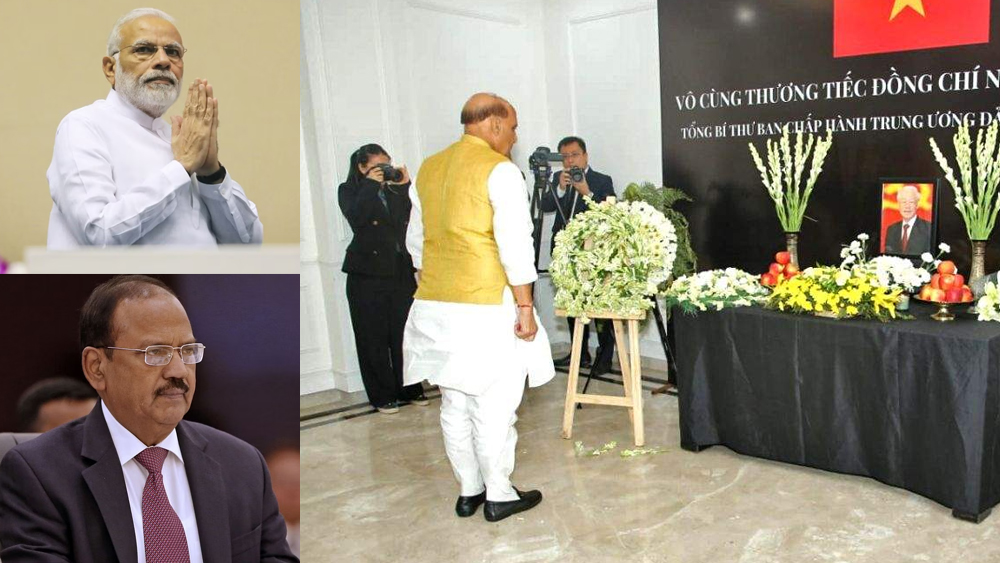 ഹനോയ്: അന്തരിച്ച വിയറ്റ്നാം നേതാവ് ന്യുയെൻ ഫു ട്രോങ്ങിന്റെ നിര്യാണത്തിൽ ആദരാഞ്ജലി അർപ്പിച്ച് പ്രധാനമന്ത്രി നരേന്ദ്രമോദിയും പ്രതിരോധമന്ത്രി രാജ്നാഥ് സിംഗും. വ്യാഴാഴ്ച ഹനോയിയിൽ നടന്ന സംസ്കാര ചടങ്ങിൽ ഇന്ത്യയെ പ്രതിനിധീകരിച്ച് ദേശീയ സുരക്ഷാ ഉപദേഷ്ടാവ് അജിത് ഡോവൽ പങ്കെടുത്തു.