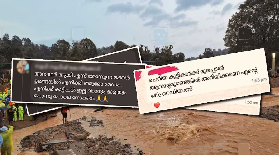 ‘ ചെറിയ കുട്ടികൾക്ക് മുലപ്പാൽ ആവശ്യമുണ്ടെങ്കിൽ അറിയിക്കണേ…എന്റെ ഭാര്യ റെഡിയാണ്’ എന്നാണ് ഒരാള് വാട്സ് ആപ് സന്ദേശത്തിലൂടെ സന്നദ്ധ പ്രവർത്തകരെ അറിയിച്ചത്. ഇതിന് പിന്നാലെ ഇടുക്കി സ്വദേശിയായ സജിനും കുടുംബവും വയനാട്ടിലെ ദുരിതാശ്വാസ ക്യാമ്പില് കുഞ്ഞുമക്കൾ ആരെങ്കിലും ഉണ്ടെങ്കില് ആ കുഞ്ഞിനെ പരിപാലിക്കാനും മുലപ്പാൽ നൽകി സംരക്ഷിക്കാനും തയാറാണെന്ന് പറഞ്ഞ് രംഗത്ത് വന്നു.