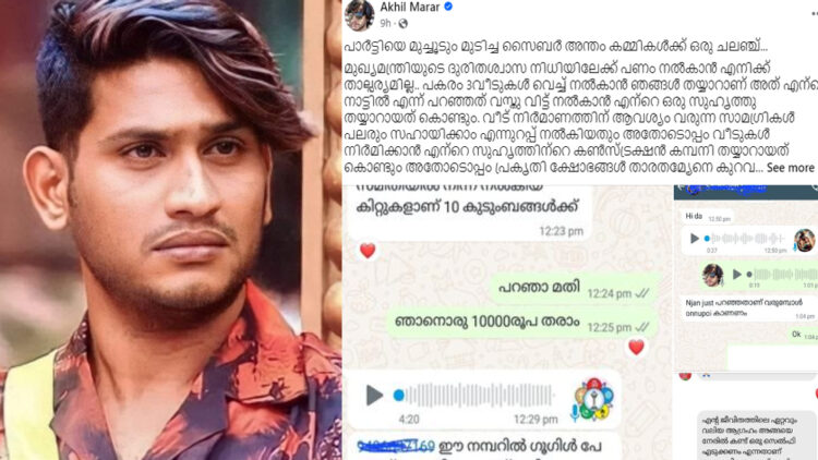 മുഖ്യമന്ത്രിയുടെ ദുരിതാശ്വാസ നിധിയിലേക്ക് പണം നൽകാൻ നൽകില്ലെന്ന് അറിയിച്ച് അഖിൽ മാരാർ. പകരം ദുരിതത്തിലായ മൂന്നു കുടുംബങ്ങൾക്ക് വീട് വെച്ച് നൽകാമെന്നും അഖിൽ മാരാർ പറഞ്ഞു. തന്റെ നാട്ടിൽ വസ്തു വിട്ടു നൽകാൻ ഒരു സുഹൃത്ത് തയ്യാറാണെന്നും വീട് നിർമാണത്തിന് ആവശ്യമായ സാധനങ്ങൾ പലരും നൽകി സഹായിക്കാമെന്ന് പറഞ്ഞിട്ടുണ്ടെന്നും അഖിൽ മാരാർ പറഞ്ഞു. വീടുകൾ നിർമിച്ചു നൽകാൻ ഒരു സുഹൃത്തിന്റെ കൺസ്ട്രക്ഷൻ കമ്പനിയും സന്നദ്ധത അറിയിച്ചിട്ടുണ്ട്.