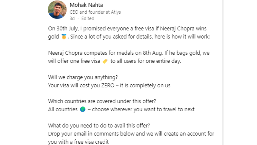 നീരജ് സ്വർണ മെഡൽ സ്വന്തമാക്കിയാൽ ഏത് രാജ്യക്കാരനും അറ്റ്ലിസ് സ്റ്റാർട്ട് അപ്പ് വഴി ഒരു ദിവസത്തെ സൗജന്യ വിസയ്ക്ക് അപേക്ഷിക്കാമെന്ന് അദ്ദേഹം വ്യക്തമാക്കി. ഇതിനായി പ്രത്യേകം പണം ഈടാക്കില്ലെന്നും അദ്ദേഹം പറഞ്ഞു. ഇ-മെയിൽ വിവരങ്ങൾ പങ്കുവയ്ക്കുന്നവർക്ക് സൗജന്യ വിസയുമായി ബന്ധപ്പെട്ട കൂടുതൽ വിവരങ്ങൾ കൈമാറാമെന്നും നെഹ്ത അറിയിച്ചു. നിമിഷനേരം കൊണ്ട് നിരവധി പേരാണ് പോസ്റ്റിന് പിന്നാലെ സൗജന്യ വിസയ്ക്കായി അപേക്ഷിച്ചത്.