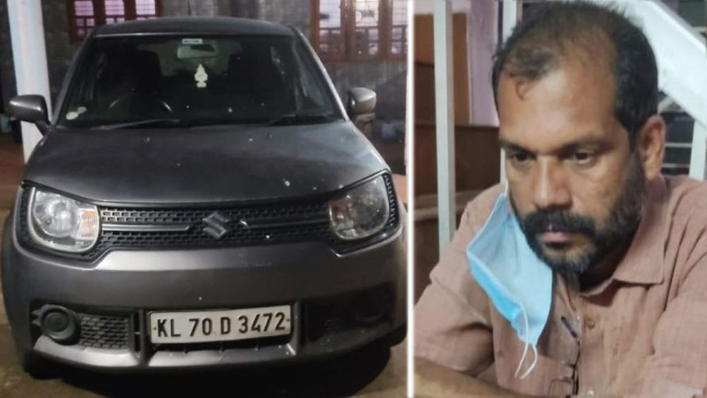 കൊല്ലങ്കോട് എക്സൈസ് സംഘത്തിന്റെ പുതുനഗരത്തെ വാഹന പരിശോധനയ്ക്കിടെയാണ് സന്തോഷ് കുടുങ്ങിയത്. കാറിന്റെ പിൻഭാഗത്തായി അര ലിറ്ററിന്റെ 108 കുപ്പികളിലായാണ് മദ്യം ഒളിപ്പിച്ചിരുന്നത്. വിൽപനയ്ക്കായി പാലക്കാട് ഭാഗത്ത് നിന്ന് കൊല്ലങ്കോട്ടേയ്ക്ക് കൊണ്ടുവരുകയായിരുന്നു മദ്യമെന്ന് എക്സൈസ് അധികൃതർ അറിയിച്ചു.