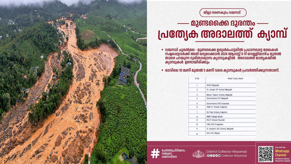 വയനാട് ചൂരൽമല – മുണ്ടക്കൈ ഉരുൾപൊട്ടലിൽ പ്രധാനപ്പെട്ട രേഖകൾ നഷ്ടപ്പെട്ടവർക്കുവേണ്ടി ദുരിതാശ്വാസ ക്യാമ്പുകളിൽ പ്രത്യേക അദാലത്ത്. നഷ്ടപ്പെട്ട രേഖകൾ ലഭ്യമാക്കാൻ 2024 ആഗസ്റ്റ് 9 ന് വെള്ളിയാഴ്ച മുതൽ താഴെ പറയുന്ന ദുരിതാശ്വാസ ക്യാമ്പുകളിൽ അദാലത്ത് മാതൃകയിൽ ക്യാമ്പുകൾ ഉണ്ടായിരിക്കുമെന്ന് അധികൃതർ അറിയിച്ചു. രാവിലെ 10 മണി മുതൽ 5 മണി വരെ ക്യാമ്പുകൾ പ്രവർത്തിക്കും. എല്ലാവർക്കും രേഖകൾ ലഭ്യമാക്കുന്നത് വരെ ഈ പ്രത്യേക അദാലത്ത് ക്യാമ്പ് തുടരുന്നതായിരിക്കും.