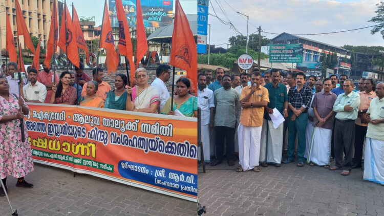 ആലുവ: പാലസ്തീന് വേണ്ടി മെഴുകുതിരി കത്തിച്ചവർ ബംഗ്ലാദേശ് കാണുന്നില്ലെന്ന് ഹിന്ദു ഐക്യവേദി സംസ്ഥാന അധ്യക്ഷൻ ആർ.വി ബാബു. ബംഗ്ലാദേശിൽ ഹിന്ദുക്കൾക്ക് എതിരായി നടക്കുന്ന അക്രമങ്ങളിൽ ഇവിടുത്തെ സാംസ്കാരിക നായകർ നടത്തുന്ന മൗനം കുറ്റകരമാണെന്നും അദ്ദേഹം പറഞ്ഞു. ബംഗ്ലാദേശ് അക്രമ സംഭവങ്ങളിൽ പ്രതിഷേധിച്ച് ഹിന്ദു ഐക്യവേദി ആലുവയിൽ നടത്തിയ പ്രതിഷേധ ധർണ ഉദ്ഘടനം ചെയ്യുകയായിരുന്നു ആർവി ബാബു.