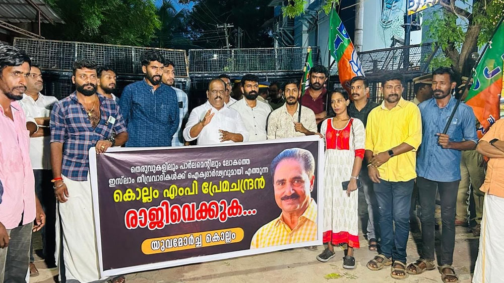 സംഭവത്തിന് പിന്നാലെ പ്രതിഷേധം ശക്തമാവുകയാണ്. കൊല്ലം എംപിയുടെ വിവാദ പ്രസ്താവനയ്ക്കെതിരെ യുവമോർച്ച ജില്ല കമ്മറ്റിയുടെ നേതൃത്വത്തിൽ പ്രതിഷേധം സംഘടിപ്പിച്ചു. എംപിയുടെ വസതിയിലേക്ക് നടന്ന മാർച്ച് ബിജെപി കൊല്ലം ജില്ലാ പ്രസിഡന്റ് ബി. ബി ഗോപകുമാർ ഉദ്ഘാടനം ചെയ്തു. ആഗോള മുസ്ലീം തീവ്രവാദത്തിന് പിന്തുണ നൽകുന്ന സമീപനമാണ് പ്രേമചന്ദ്രൻ്റേതെന്ന് ബി ബി ഗോപകുമാർ വിമർശിച്ചു.