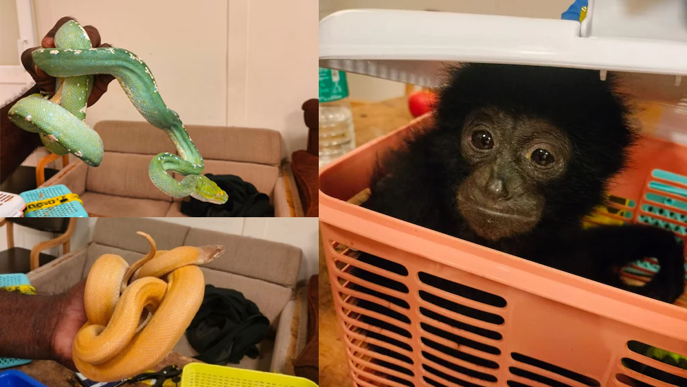 രണ്ട് ഫ്ലൈയിം​ഗ് ലെമുർ, അഞ്ച് ഇന്തോ-ചീൻ ബോക്സ് ടർട്ടിൽ, ഒമ്പത് our-eyed ടർട്ടിൽ, ഒരു Keeled box ടർട്ടിൽ, ഒരു റെഡ് ഫോർട്ട് ടോർട്ടോയിസ്, രണ്ട് ​ഗ്രീൻ ട്രീ പിത്തൺ, ഒരു വൈറ്റ് ലിപ്പ്ഡ് പിത്തൺ‌ എന്നിവയെ കസ്റ്റംസ് കണ്ടെത്തി. വന്യജീവി സംരക്ഷണ നിയമം 1972 പ്രകാരം ഷെഡ്യൂൾ നാലിൽ ഉൾപ്പെടുത്തിയിട്ടുള്ള ജന്തുക്കളാണിവ. പ്രതിയെ അറസ്റ്റ് ചെയ്ത ജുഡീഷ്യൽ കസ്റ്റഡിയിൽ വിട്ടിരിക്കുകയാണ് കസ്റ്റംസ്.
