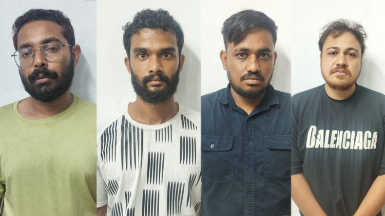മലപ്പുറം എടരിക്കോട് ചിതലപ്പാറ സ്വദേശി എടക്കണ്ടൻ വീട്ടിൽ അബ്ദുറഹ്മാൻ (25), എടക്കോട് പുതുപറമ്പ് സ്വദേശി കാട്ടികുളങ്ങര വീട്ടിൽ സാദിഖ് അലി (32), കുറ്റിപ്പുറം സ്വദേശി തടത്തിൽ വീട്ടിൽ ജിത്തു കൃഷ്ണൻ (24), കാട്ടിപ്പറത്തി കഞ്ഞിപ്പുര സ്വദേശി ചെറുവത്തൂർ വീട്ടിൽ രോഷൻ റഷീദ് (26) എന്നിവരെയാണ് തൃശൂർ സിറ്റി സൈബർ ക്രൈം പോലീസ് അന്വേഷണ സംഘം പിടികൂടിയത്.