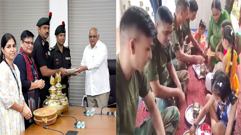 ഗാന്ധിനഗർ: രക്ഷാബന്ധന് മുന്നോടിയായി രാജ്യസുരക്ഷയ്‌ക്കായി അതിർത്തിയിൽ കാവൽ നിൽക്കുന്ന സൈനികർക്ക് രാഖികൾ അയച്ചുനൽകാൻ ഗുജറാത്തിലെ അങ്കണവാടി തൊഴിലാളികൾ.’ഒരു രാഖി രാജ്യത്തെ സൈനികർക്കുവേണ്ടി’ എന്ന കേന്ദ്ര സർക്കാരിന്റെ ക്യാമ്പയിന്റെ ഭാഗമായാണ് രാഖികൾ അയച്ചു നൽകുന്നത്. ഗുജറാത്ത് മുഖ്യമന്ത്രി ഭൂപേന്ദ്ര പട്ടേൽ വനിതാ ശിശുക്ഷേമ വകുപ്പ് മന്ത്രി ഭാനുബെൻ ബാബരിയ എന്നിവർ ചേർന്ന് ലെഫ്. കേണൽ രാകേഷ് കുമാറിനും സബ് മേജർ സന്തോഷ് കാംതെയ്‌ക്കും രക്ഷാ കലശം കൈമാറി ക്യാമ്പയിൻ ഉദ്ഘാടനം ചെയ്‌തു.