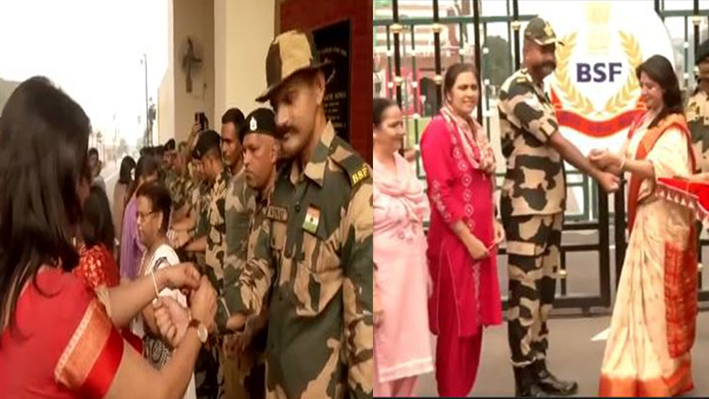 ചണ്ഡീഗഡ്: രാജ്യം മുഴുവൻ രക്ഷാബന്ധൻ ആഘോഷിക്കുമ്പോൾ കുടുംബത്തെ വിട്ട് അതിർത്തിയിൽ രക്ഷകരായി നിൽക്കുന്ന ബിഎസ്എഫ് ജവാന്മാരോടൊപ്പം രക്ഷാബന്ധൻ ആഘോഷമാക്കി യുവതികൾ. പഞ്ചാബ് അമൃത്സറിലെ അട്ടാരി-വാഗാ അതിർത്തിയിൽ സേവനമനുഷ്ഠിക്കുന്ന ജവാന്മാരോടൊപ്പമാണ് രക്ഷാബന്ധൻ ആഘോഷിച്ചത്. ജവാന്മാർക്ക് രാഖി അണിയിച്ചും മധുരം പങ്കിട്ടും യുവതികളും കുട്ടികളും രക്ഷാബന്ധൻ ആഘോഷിച്ചു.