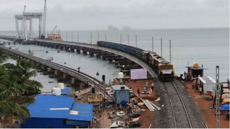രാമേശ്വരം : പുതുക്കിപ്പണിയുന്ന പാമ്പൻ പാലം പ്രവർത്തന സജ്ജമാകുന്നതിലേക്ക് ഒരു പടി കൂടി കടന്നിരിക്കുന്നു. പുതിയ പാമ്പൻ പാലത്തിൽ ആദ്യമായി ട്രെയിനിന്റെ പരീക്ഷണ ഓട്ടം വിജയകരമായി പൂർത്തിയാക്കി. 11 കോച്ചുകളുള്ള ചരക്ക് തീവണ്ടി ഓടിച്ചാണ് പാലത്തിൽ പരീക്ഷണ ഓട്ടം നടത്തിയത്.