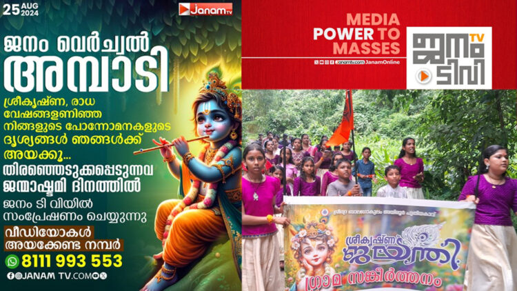 കൃഷ്ണന്റെയും രാധയുടെയുമൊക്കെ വേഷങ്ങളണിഞ്ഞ് നിൽക്കുന്ന കുട്ടികളുടെ ദൃശ്യങ്ങൾ janam വെർച്വൽ അമ്പാടിയിലേക്ക് അയയ്ക്കാം. നിങ്ങളുടെ പൊന്നോമനകളുടെ മനോഹര ദൃശ്യങ്ങൾ ലോകം മുഴുവൻ കാണാൻ അവസരമൊരുക്കുകയാണ് ജനം ടിവി.