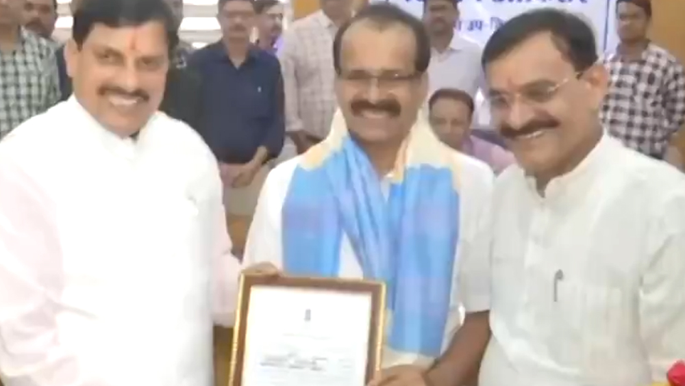 #WATCH | Bhopal | BJP leader George Kurien was elected unopposed to Rajya Sabha from Madhya Pradesh and received the election certificate today. CM Mohan Yadav and Member of Parliament & state BJP President VD Sharma congratulated him. pic.twitter.com/eXdUAxmfHO