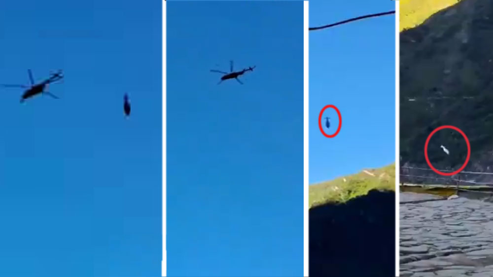 VIDEO | Uttarakhand: A defective helicopter, which was being air lifted from #Kedarnath by another chopper, accidentally fell from mid-air as the towing rope snapped, earlier today.#UttarakhandNews