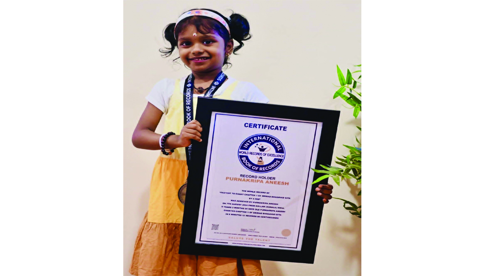 കൊല്ലം: ശ്രീമദ് ഭഗവദ് ഗീതയിലെ ഒന്നാം അദ്ധ്യായം എട്ട് മിനിറ്റ് പതിമൂന്ന് സെക്കൻഡ് കൊണ്ട് കാണാതെ ചൊല്ലി കഴിവ് തെളിയിച്ച് അഞ്ചുവയസ്സുകാരി പൂർണ്ണകൃപ, ഇന്റർനാഷണൽ ബുക്ക് ഓഫ് റെക്കോർഡ്സിൽ ഇടം പിടിച്ചു. ഈ നേട്ടം കരസ്ഥമാക്കുന്ന ഏറ്റവും പ്രായം കുറഞ്ഞ മലയാളിയാണ് പൂർണ്ണകൃപ. മുൻപ് സംസ്കൃതത്തിലും കഴിവ് തെളിയിച്ച് ഇന്ത്യൻ ബുക്ക് ഓഫ് റെക്കോർഡ്സും കരസ്ഥമാക്കിയിരുന്നു ഇ മിടുക്കി. അമ്യതപുരി മാതാ അമൃതാനന്ദമയീ ആശ്രമത്തിലെ മുതിർന്ന സ്വാമി ധ്യാനാമൃതയാണ് പൂർണ്ണകൃപക്ക് ഭഗവദ്ഗീതയുടെ ആത്മീയ അറിവുകൾ പകർന്നു നൽകിയത്.