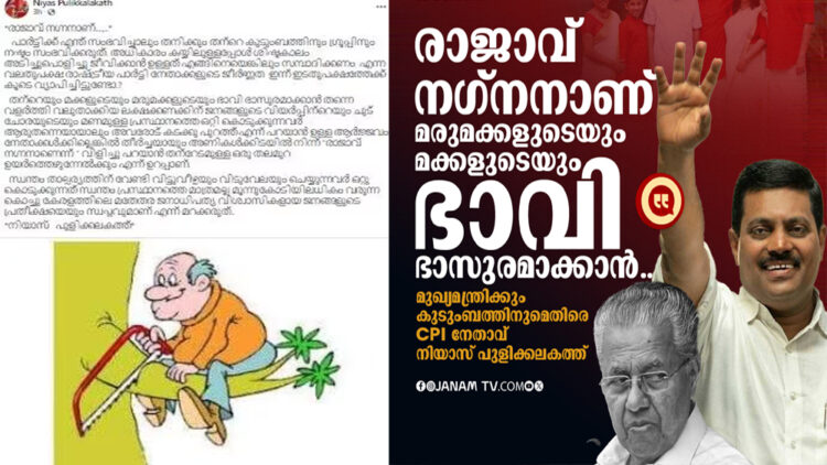 തന്റെയും മക്കളുടെയും മരുമക്കളുടെയും ഭാവി ഭാസുരമാക്കാൻ തന്നെ വളർത്തിയ പ്രസ്ഥാനത്തെ ഒറ്റി കൊടുക്കുന്നവരോട്, കടക്കു പുറത്ത് എന്ന് പറയാനുള്ള ആർജ്ജവം നേതാക്കൾക്കില്ലെങ്കിലും അണികൾക്കൾക്കുണ്ടാകുമെന്ന് സിപിഐ നേതാവിന്റെ ഫേസ്ബുക്ക് പോസ്റ്റിൽ പറയുന്നു . എന്നാൽ പോസ്റ്റ് ചർച്ചയായതോടെ രാജാവ് നഗ്നനാണ് എന്ന തലക്കെട്ടോയുള്ള കുറിപ്പ് നിയാസ് പുളിക്കലകത്ത് ഡിലിറ്റ് ചെയ്തു.