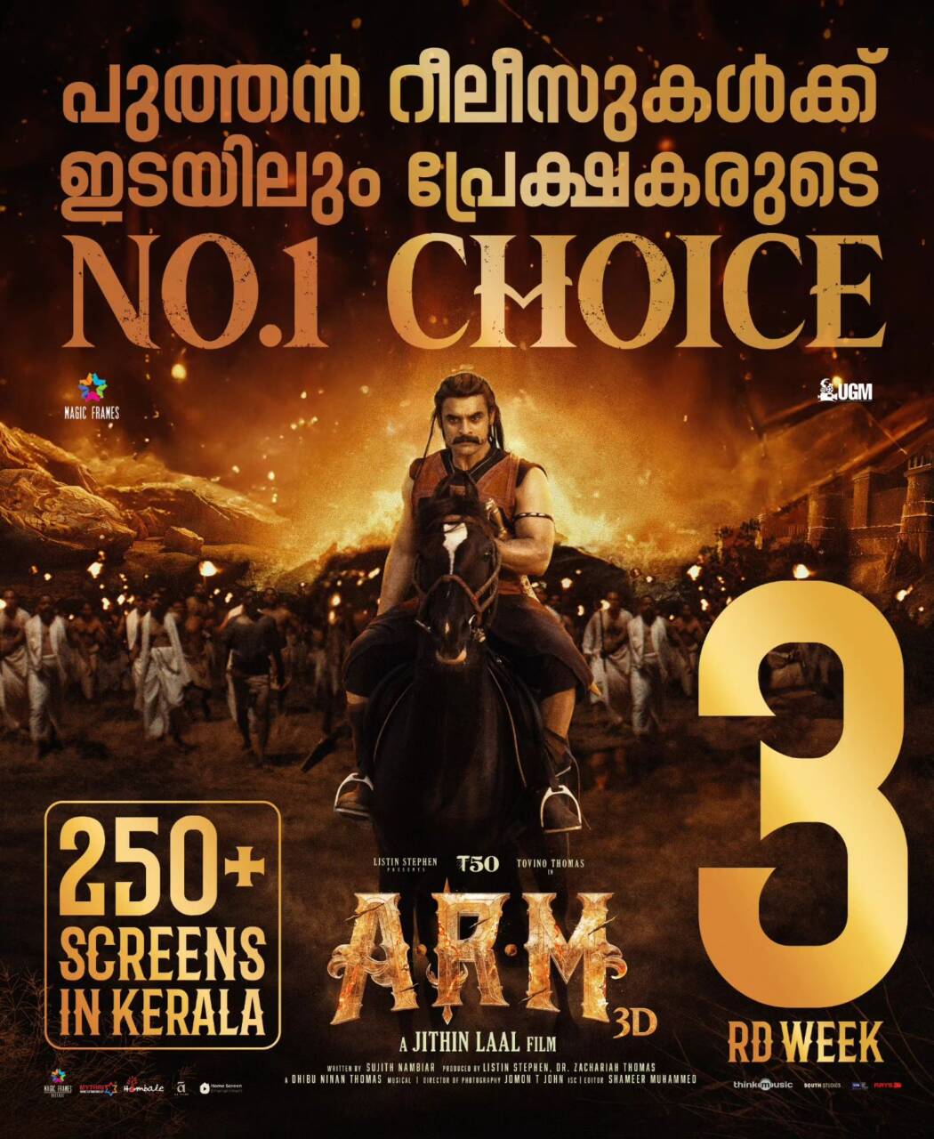 വിജയക്കുതിപ്പ് തുടർന്ന് ടൊവിനോ തോമസ് ചിത്രം അജയന്റെ രണ്ടാം മോഷണം. മൂന്നാം വാരത്തിലേക്ക് കടക്കുമ്പോൾ ബോക്സോഫീസിൽ വിജയ​ഗാഥ തുടരുകയാണ് ചിത്രം. സിനിമയുടെ പുതിയ പോസ്റ്ററും അണിയറപ്രവർത്തകർ പങ്കുവച്ചു. പുത്തൻ റിലീസുകൾക്കിടയിലും പ്രേക്ഷകരുടെ നമ്പർ വൺ ചോയിസ് എആർഎം എന്നാണ് പോസ്റ്ററിൽ കുറിച്ചിരിക്കുന്നത്. കേരളത്തിൽ മാത്രം 250 സ്ക്രീനുകളിലാണ് ചിത്രം വിജയകരമായി പ്രദർശനം തുടരുന്നത്.